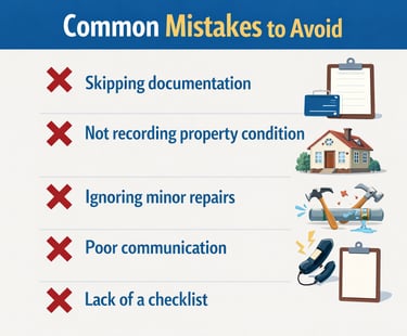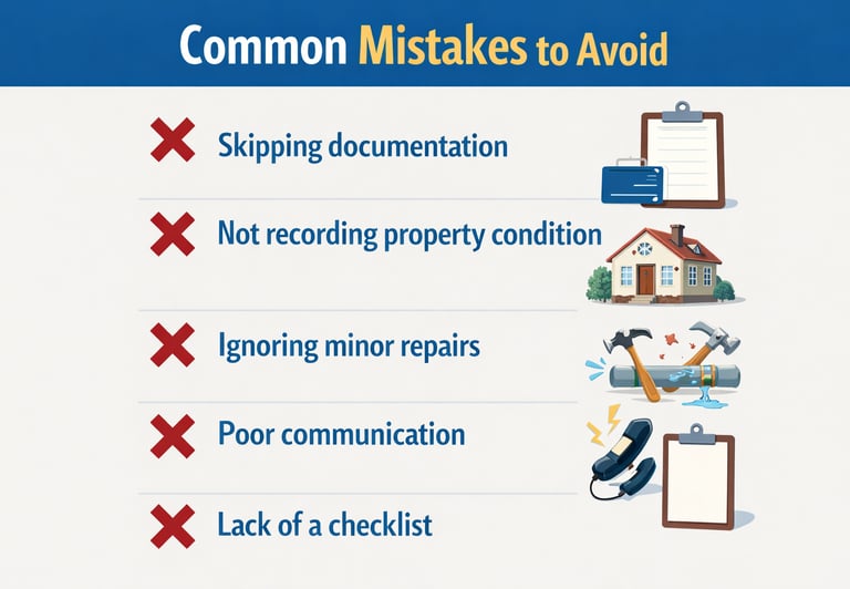 Common mistakes include poor documentation, lack of inspection, missing checklist items, and inadequate communication.